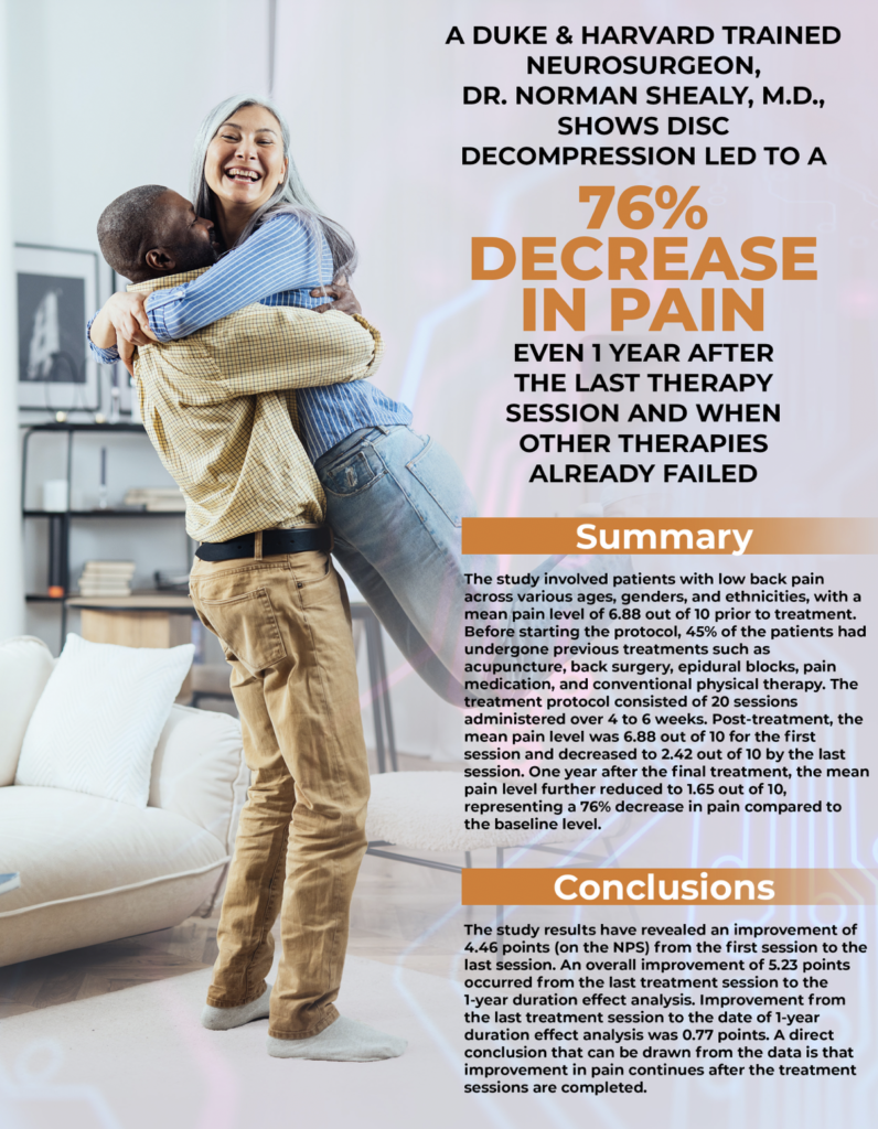 We are pleased to share with you the non-surgical solution for a Herniated Disc, Ruptured Disc, Bulging Disc, Compressed Disc, Sciatica or a Pinched Nerve. Spinal Decompression is a non-invasive and non-surgical treatment.