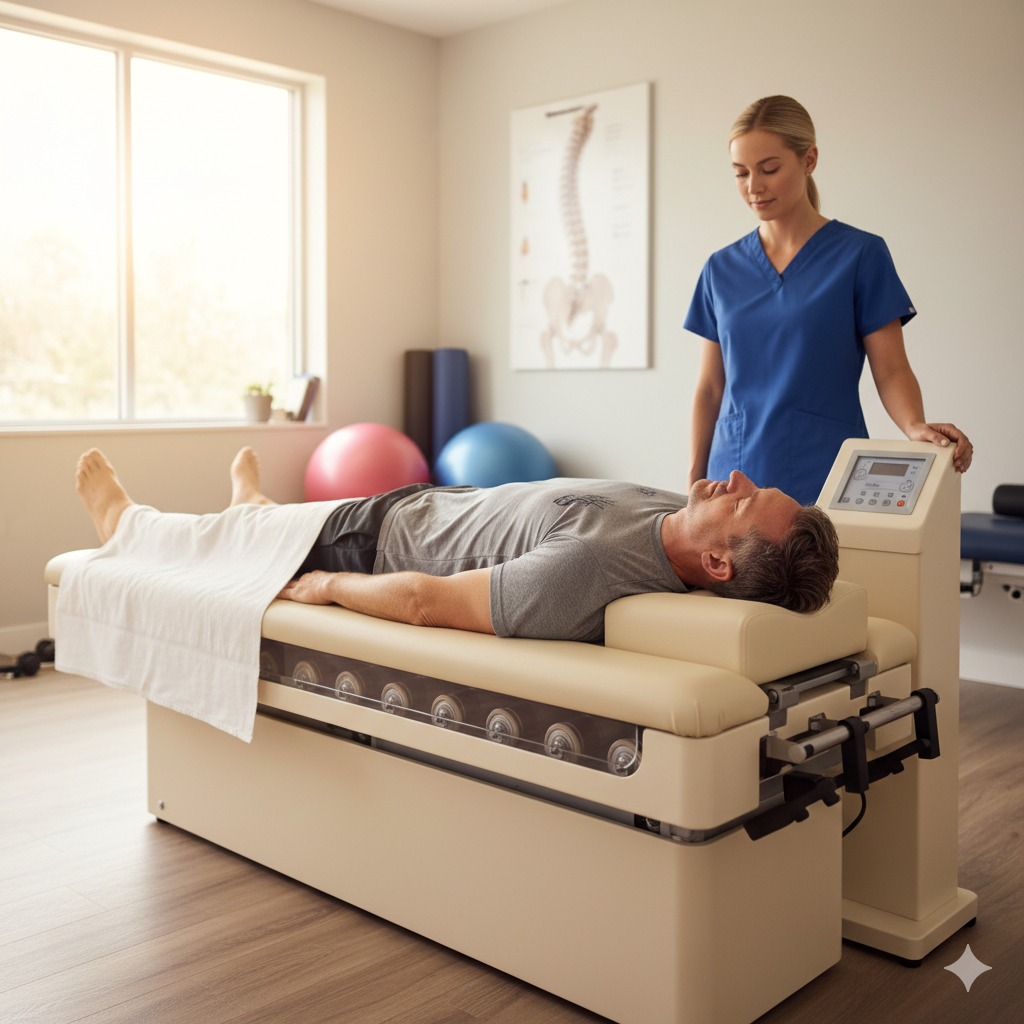 Patients simply lie back on a specialized table while internal rollers slowly and rhythmically move up and down the length of the spine. Just think of it as a massage table that does all the work on its own. Not only does it feel great, it also: